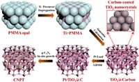 Light source and the catalysts are two important factors affecting photocatalytic reduction of CO2. The interface is not only the place of reaction, but also the place of light absorption in the case of photocatalysis reaction. Therefore, the construction of high pore morphology is usually the direct way to optimize the photocatalytic efficiency. Order macroporous (OM) structure of optical crystal catalysts, also known as inverse opal structure, is composed of highly ordered and tightly connected pores with high porosity and surface area. OM structure in the crystal morphology has slow photon effect [14], which can use the refraction principle to extend the light wave path and make full use of ultraviolet light. OM structured TiO2 can provide the additional space for CO2 absorption and diffusion separation of reduction products. Furthermore, in order to further enhance the photocatalytic activity of CO2 reduction and improve the adsorption efficiency of CO2, it is necessary to modify the surface of OM structured TiO2-based catalysts (Fig. 2) [15–17].