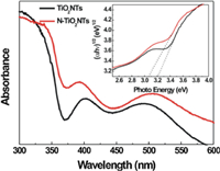 | Fig. 8. UV–vis DRS of TiO2 NTs and N-doped TiO2 NTs. Reprinted with permission [56]. Copyright 2013, Elsevier. | |