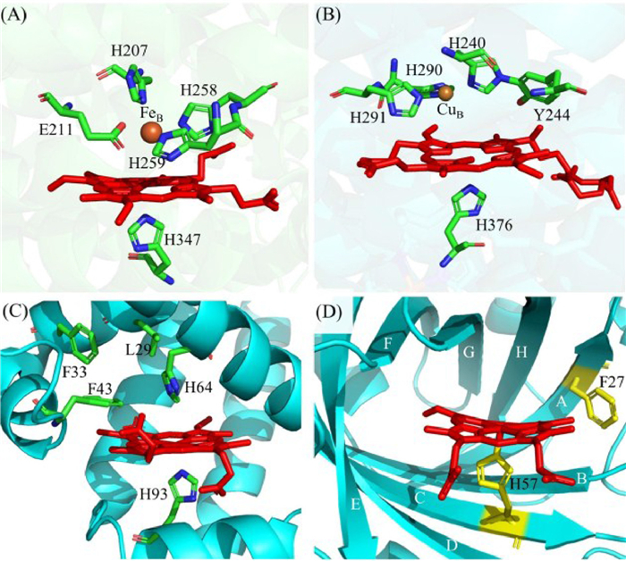 | Fig. 1. Active site structures of (A) NOR with heme/FeB (PDB code: 3O0R) and (B) HCO with heme/CuB (PDB code: 5B1B). (C) Heme pocket of sperm whale Mb, highlighting key amino acid residues for engineering into HCO/NOR models (PDB code: 1VXA), (D) heme pocket of NP2, highlighting the site of mutation in this work, i.e., F27 (PDB code: 1EUO). | |