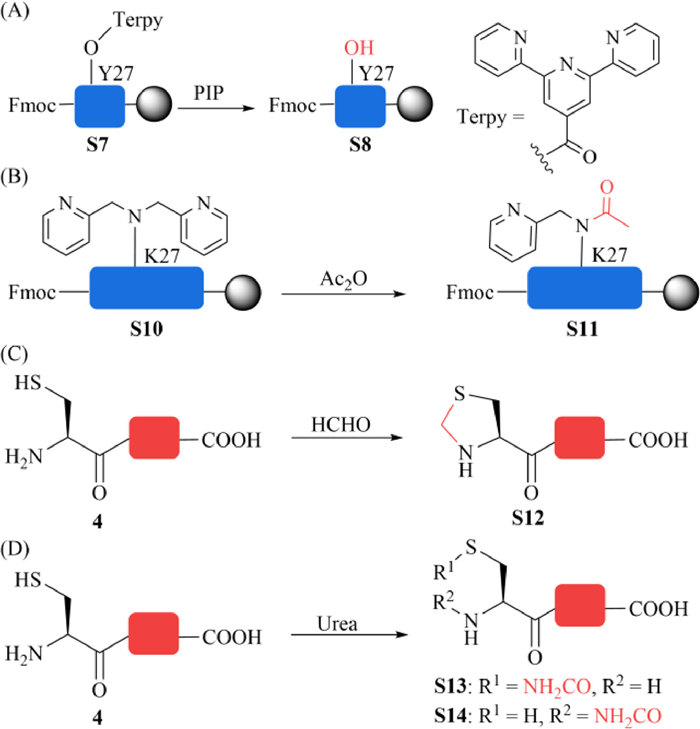 Subsequently, efforts were made to obtain the expressed protein segment 4, which was expressed with its C-terminal fused to a His6-SUMO tag. Upon purification, the fusion protein was conveniently cleaved with SUMO-specific protease Ulp1 to offer segment 4 in 20 mg/L LB (Fig. 3D, Figs. S10 and S11 in Supporting information) [39,40]. It was noteworthy that two side reactions were observed during purification of peptide 4: 1) Formation of tetrahydrothiazolane at the N-terminus with formaldehyde (Fig. 2C and Fig. S12 in Supporting information), which can be removed by incubation with O-methoxyamine at pH 4 [41]. 2) N-terminal carbamylation at either thiol or amine group by the denaturing agent urea (Fig. 2D and Fig. S13 in Supporting information) [42], which could be avoided by switching to guanidine-HCl (GdmCl).