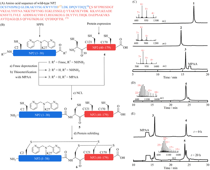 | Fig. 3. (A) Amino acid sequence of wild-type NP2. The mutation site is marked in orange and the ligation site was underlined. (B) The semi-synthetic strategy of NP2-F27K(Dpa). (C) The analytical HPLC traces of 1, its Fmoc deprotection, and thioesterification with MPAA. Inset: ESI-MS analysis of 1 (calc. 4824.2 Da, obsd. 4823.8 Da), 2 (calc. 4602.2 Da, obsd. 4601.1 Da) and 3 (calc. 4738.4 Da, obsd. 4737.5 Da). (D) The analytical HPLC trace of 4 after Ni immobilized metal-ion affinity chromatography (Ni-IMAC) purification. Inset: ESI-MS analysis of 4. (calc. 15,515.2 Da, obsd. 15,513.0 Da). (E) The analytical HPLC traces of the NCL between peptide 3 and peptide 4. Inset: ESI-MS analysis of 5 (calc. 20,085.1 Da, obsd. 20,083.5 Da). | |