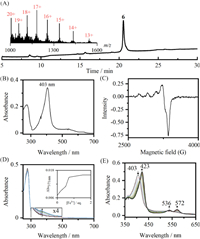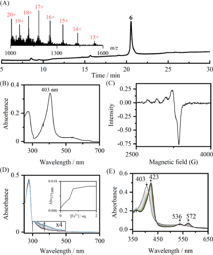 | Fig. 4. (A) Analytical HPLC trace of 6. Inset: ESI-MS analysis of 6 (calc. 20,081.3 Da, obsd. 20,077.1 Da). (B) UV–vis absorption spectrum of holoprotein NP2-F27K(Dpa). Protein conc. 2.4 µmol/L, in 0.1 mmol/L NaOAc, 0.1 mmol/L NaCl, 2% glycerol, pH 5.5. (C) X-band EPR spectrum of NP2-F27K(Dpa-CuⅡ). Protein conc. 200 µmol/L, in 0.1 mol/L MOPS, 10% glycerin, pH 7.2, 100 K. (D) UV–vis absorption spectroscopy of FeⅢ titration into apo-NP2-F27K(Dpa). Inset: The absorption at 371 nm upon addition of FeⅢ ions. Protein conc. 21 µmol/L, in 0.1 mol/L NaOAc, 0.1 mol/L NaCl, pH 5.5. (E) The UV–vis absorption spectroscopy of the reaction of holoprotein NP2-F27K(Dpa) with NaNO2. Protein conc. 3.3 µmol/L, in 0.1 mol/L NaH2PO4, 0.1 mol/L NaCl, pH 5.5, 1.7 mmol/L NaNO2. | |