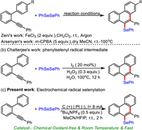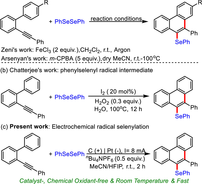 Phenanthrene represents a core structural motif which is largely distributed in naturally occurring compounds and biologically active molecules [29–31]. As such, the quest for the development of effective approaches for constructing functionalized phenanthrenes has been actively pursued over the past decade [32–40]. Arylselanyl phenanthrenes are a significant class of unsymmetrical diaryl selenides and have revealed potential applications in pharmaceutical and materials science. Given its abundance and easy availability, diorganyl diselenide is considered as an attractive selanylation reagent for the synthesis of organoselenium compounds [41–50]. The groups of Zeni [51] and Arsenyan [52] reported the electrophilic selanylative annulation of 2-alkynyl biaryls with diselenides using FeCl3 and m-CPBA as the mediator/oxidant, respectively (Scheme 1a). Recently, Chatterjee and coworkers reported the radical selanylative annulation [53,54] with molecular iodine as the catalyst and hydrogen peroxide as the oxidant at 100 ℃ (Scheme 1b) [51]. Despite these significant achievements, from a practical point of view, these methods still suffer from some drawbacks, such as the use of chemical oxidant, inconveniently long reaction time as well as high reaction temperature. As a consequence, the development of more eco-friendly and practical synthetic strategy for arylselanyl phenanthrenes under mild conditions is still highly desirable.