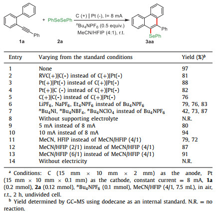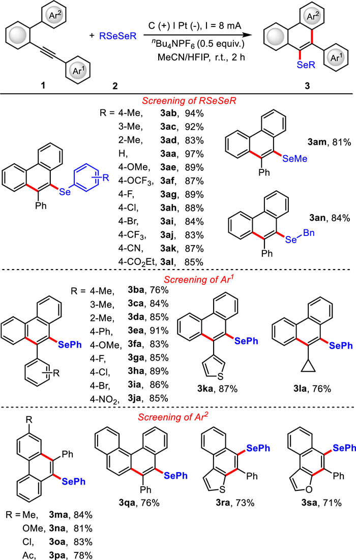 We started our investigation by using the 2-(phenylethynyl)-1,1-biphenyl (1a) and diphenyl diselenide (2a) as the template substrates (Table 1). To our delight, we found that conducting this electrolysis with nBu4NPF6 (0.5 equiv.) as the electrolyte and a mixed solvent of MeCN/HFIP (4/1) as the reaction medium in an undivided cell equipped with C(+)/Pt(-) electrode pair under 8 mA constant current at room temperature gave the desired product 3aa in 97% GC yield (Table 1, entry 1). Performing the reaction with other electrode pair resulted in the formation of 3aa in 76%−88% yields (entries 2–5). Lower yields were obtained when nBu4NPF6 was replaced by other hexafluorophosphate salts or tetrabutylammonium salt (entries 6 and 7). The selenylation did not take place without an electrolyte (entry 8). Varying the constant current did not provide improved yield of 3aa (entries 9 and 10). Replacing the mixed solvent with MeCN or HFIP as a single solvent or changing the ratio of mixed solvents led to a diminished outcome (entries 11–13). Finally, no reaction occurred without the constant current; thus, the conversion could be precisely controlled by switching the electric current on or off (entry 14).