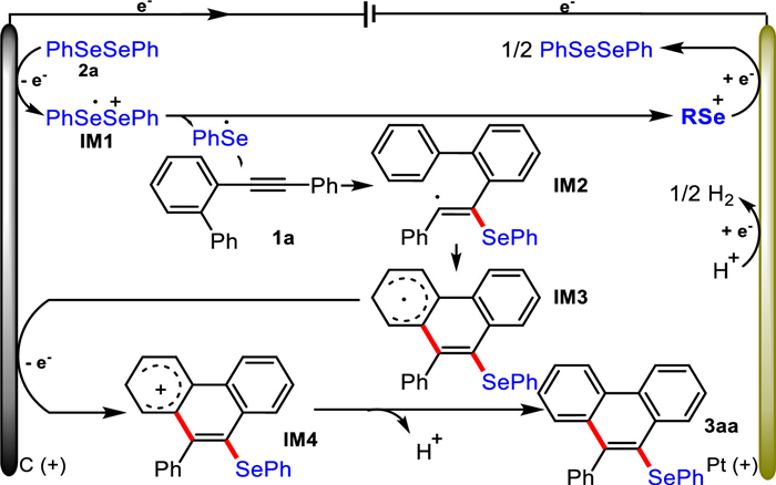 Based on the above results and previous reports [35,62], the electrochemical radical annulation reaction mechanism was proposed as shown in Scheme 5. Firstly, diphenyl diselenide (2a) was oxidized at the graphite cathode to give a radical cation intermediate IM1, which decomposed into a phenylselenyl radical and phenylselenyl cation. The phenylselenyl cation was reduced at the platinum cathode to re-generate 2a for the next cycle. Meanwhile, the phenylselenyl radical was added to the alkynyl moiety of 1a to form a radical IM2, followed by an intramolecular cyclization process to generate a radical IM3, which underwent a one-electron oxidation at the anode to deliver the phenanthrene cation IM4. Finally, the intermediate IM4 underwent dehydrogenation and aromatization to deliver the target product 3aa. During the electrolysis process, the innocent side-product hydrogen gas was produced through one-electron reduction at the platinum cathode.
