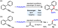 To elucidate mechanism of the radical annulation, both control experiments and cyclic voltammetry experiments were conducted. The formation of 3aa was completely inhibited upon the addition of stoichiometric TEMPO or BHT under the standard conditions (Scheme 4a). Furthermore, the adduct 4a of 1,1-diphenylethylene and phenylselenyl radical was detected by ESI-MS analysis (Scheme 4b). These experimental results suggested that the electrolysis may proceed through a free radical pathway.