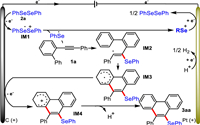 Next, the cyclic voltammetry experiments for selenylative annulation of 2-alkynyl biaryls with diselenides was explored (Fig. 1). Diselenide 2a presented an oxidative peak at E = 1.46 V vs. Ag/AgCl, which was much lower than that of 2-alkynyl biaryl 1a (E = 1.88 V vs. Ag/AgCl), and similar result was observed for the mixture of 1a and 2a. These results indicating that the anodic oxidation of 2a might occur preferentially.