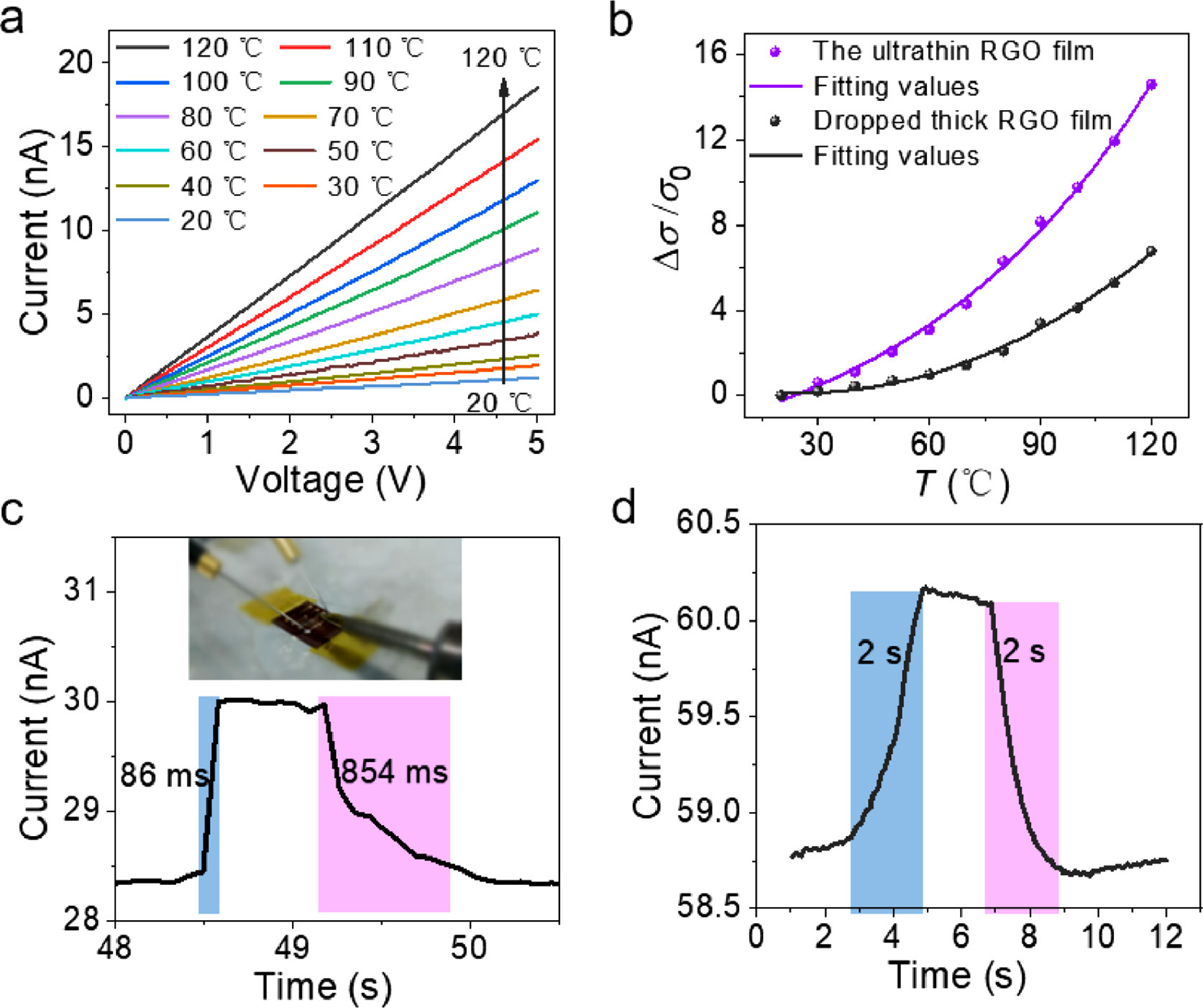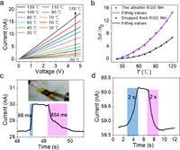 | Fig. 2. Response time and sensitivity of the ultrathin RGO sensor. (a) I-V curves of ultrathin RGO sensor in the temperature range of 20–120 ℃ (temperature step set as 10 ℃). (b) Conductivity variation of the ultrathin and the thick RGO sensors with temperature. Response time of (c) the ultrathin RGO sensor (~3 nm) and (d) the thicker RGO sensor (~200 nm). | |