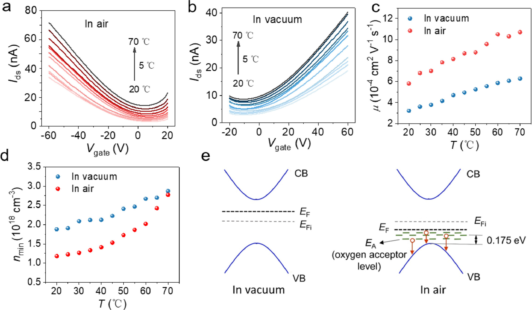 | Fig. 4. Characteristics of ultrathin RGO FET in air and vacuum. (a, b) Transfer characteristics of ultrathin RGO FET measured over the temperature range of 20–70 ℃ in air and vacuum. Vds= 5 V. (c) The carrier mobility of ultrathin RGO FET at variable temperature in air and vacuum. (d) The carrier concentration at variable temperature in air and vacuum. (e) Band diagrams of RGO before and after oxygen doping. EF, EFi, CB and VB represent the Fermi level, the intrinsic Fermi level, the conduction band and the valence band, respectively. | |