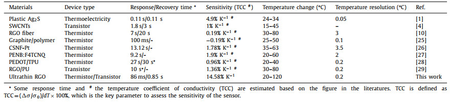 Here, we develop a strategy to overcome this challenge by minimizing the thickness of RGO films (~3 nm) to increase oxygen absorption, which significantly increases the conductance activation energy of RGO and thus greatly improves the temperature dependence of thermal-activated charge transport. Remarkably, our RGO sensors show high sensitivity with temperature conductive coefficient of 14.58% K−1, which is one order of magnitude higher than the reported CNT or graphene-based devices. Moreover, the ultrathin thickness and high thermal conductivity of RGO film allow an ultrafast response time ~86 ms, which represents the best level of temperature sensors based on soft materials.