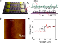 | Fig. 1. Structure of the ultrathin RGO sensors. (a) Schematic of the ultrathin RGO temperature sensors and chemical structure of ultrathin RGO film. (b) AFM image and (c) section profile of the edge of an ultrathin GO film. | |