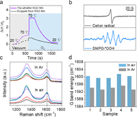 | Fig. 3. Effect of oxygen doping on high sensitivity of the ultrathin RGO sensor. (a) The current of RGO sensor measured in vacuum when temperature changes from 20 ℃ to 70 ℃. (b) The EPR signals of cation radical and O2− (DMPO-•OOH) in RGO. DMPO-•OOH shows the six peaks with the hyperfine coupling constants AN ≈ 15 G and Ahβ ≈ 11 G. (c, d) Raman spectrum and statistics of the Raman G band frequency of five ultrathin RGO films in air and Ar. | |