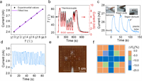 | Fig. 5. Accurate measurement and exemplary applications of the ultrathin RGO sensor. (a) Resolution of the temperature sensor. (b) The temperature measurement of ultrathin RGO sensor and thermocouple. (c) The current response of the ultrathin RGO sensor to finger touch. (d) The device monitored respiratory rate by measuring the heat of breathing gas. (e) Photograph of a 5 × 5 ultrathin RGO sensor array. (f) Temperature distribution measured from the sensor array. | |