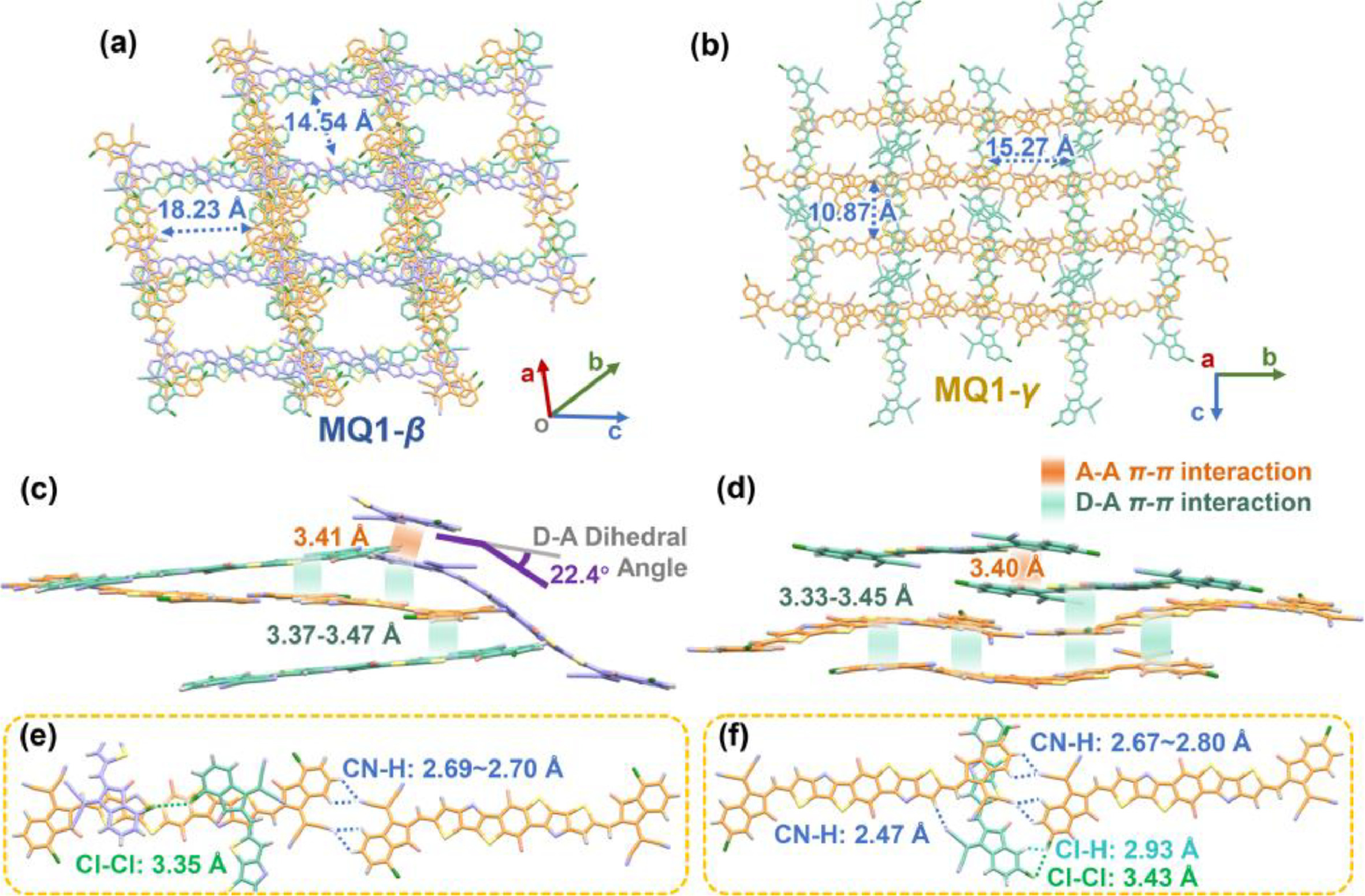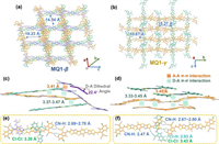 | Fig. 2. Single crystal structures and packing modes diagrams. The 3D interpenetrating networks of MQ1-β (a) and MQ1-γ (b). The stacking modes and noncovalent interaction distance of MQ1-β (c) and MQ1-γ (d) from the side view of π-face-on perspective. The noncovalent interaction diagrams about the similar dimer and adjacent molecules of MQ1-β (e) and MQ1-γ (f) from the π-face-on perspective. Alkyl chains are omitted for ease of viewing. | |