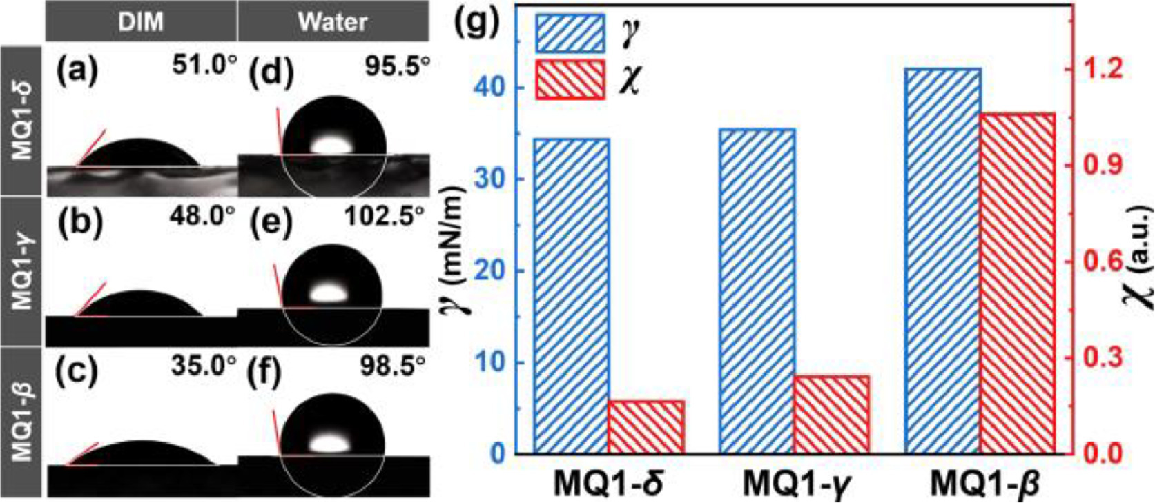 | Fig. 4. The measured (a-c) DIM (diiodomethane) and (d-f) water contact angles of MQ1-δ, MQ1-γ, and MQ1-β. (g) Bar chart visualization of interfacial interaction analysis about surface energy (γ) and Flory-Huggins interaction parameter (χ) based on PM6:MQ1-δ, PM6:MQ1-γ, PM6:MQ1-β. | |