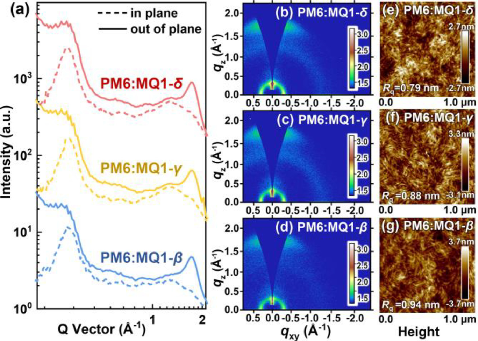 | Fig. 5. (a) GIWAXS 1D linecuts in the out-of-plane and in-plane directions, (b-d) 2D GIWAXS patterns, (e-g) AFM height images of annealed blend films based on PM6:MQ1-δ, PM6:MQ1-γ, and PM6:MQ1-β. | |