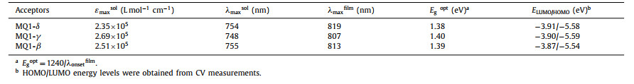 Table 1 Photophysical and electrochemical parameters of the nonfullerene acceptors. |