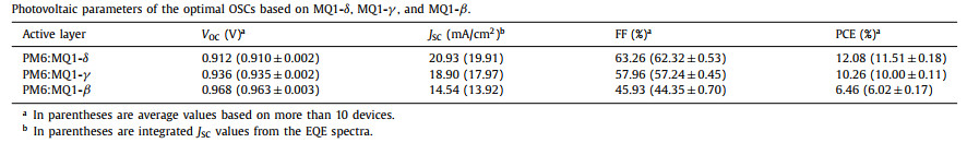 Table 2 Photovoltaic parameters of the optimal OSCs based on MQ1-δ, MQ1-γ, and MQ1-β. |