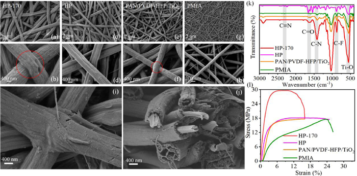 | Fig. 1. (a-j) SEM images of four different electrospinning separators: (a, b) HP-170; (c, d) HP; (e, f) PAN/PVDF-HFP/TiO2; (g, h) PMIA; (i) magnification image of HP-170; (j) cross-sectional view of HP-170. (k) FTIR spectra and (l) tensile strength of HP-170, HP, PAN/PVDF-HFP/TiO2 and PMIA separators. | |