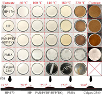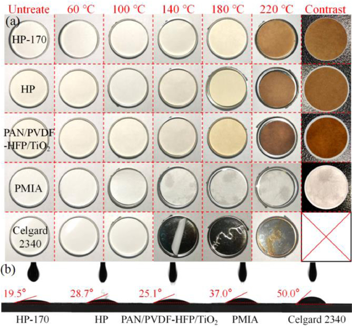 | Fig. 2. (a) Thermal shrinkage tests and (b) liquid electrolyte contact angle tests of HP-170, HP, PAN/PVDF-HFP/TiO2, PMIA and Celgard 2340 separators. | |