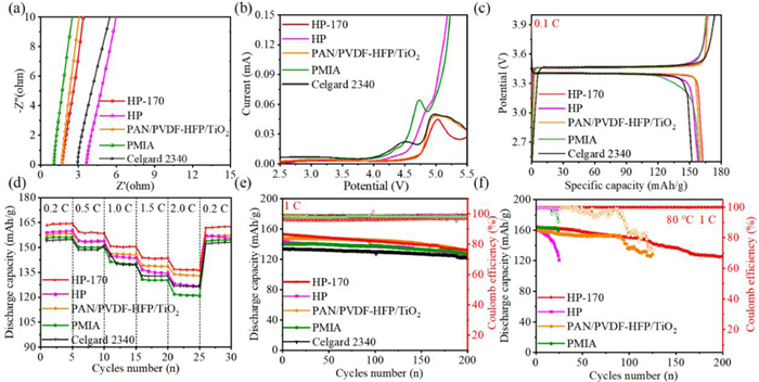 | Fig. 3. (a) The electrochemical impedance spectroscopies of SS//separator//SS cells with HP-170, HP, PAN/PVDF-HFP/TiO2, PMIA and Celgard 2340 separators. (b) Linear sweep voltammetry curves from 2.5 V to 5.5 V of the five different separators. (c) The initial charge-discharge curves at 0.1 C and (d) rate performances of the LiFePO4/Li cells with HP-170, HP, PAN/PVDF-HFP/TiO2, PMIA and Celgard 2340 separators. Cyclic stability tests of various separators (e) at room temperature and (f) at 80 ℃ at 1 C. | |