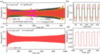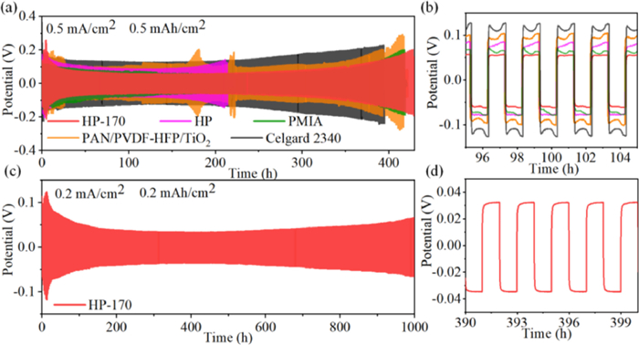 | Fig. 4. (a) Voltage profiles of symmetric Li/Li cells with HP-170, HP, PAN/PVDF-HFP/TiO2, PMIA and Celgard 2340 separators at 0.5 mA/cm2. (b) Partial enlarged view of Fig. 4a. (c) Voltage profile of symmetric Li/Li cell with HP-170 at 0.2 mA/cm2. (d) Partial enlarged view of Fig. 4c. | |