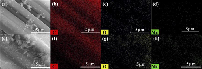 | Fig. 1. Scanning electron micrographs and energy dispersive spectrometry elemental mapping of (a–d) activated carbon fiber (ACF) and (e–h) MnOx@ACF. | |
