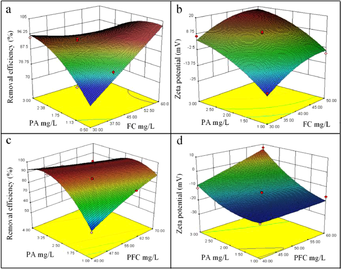 | Fig. 1. Response surface diagram of the effect of dosage on removal efficiency (a) FC-PA, (c) PFC-PA. Response surface diagram of the effect of dosage on zeta potential (b) FC-PA, (d) PFC-PA. | |