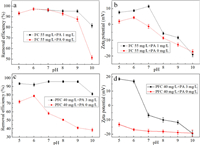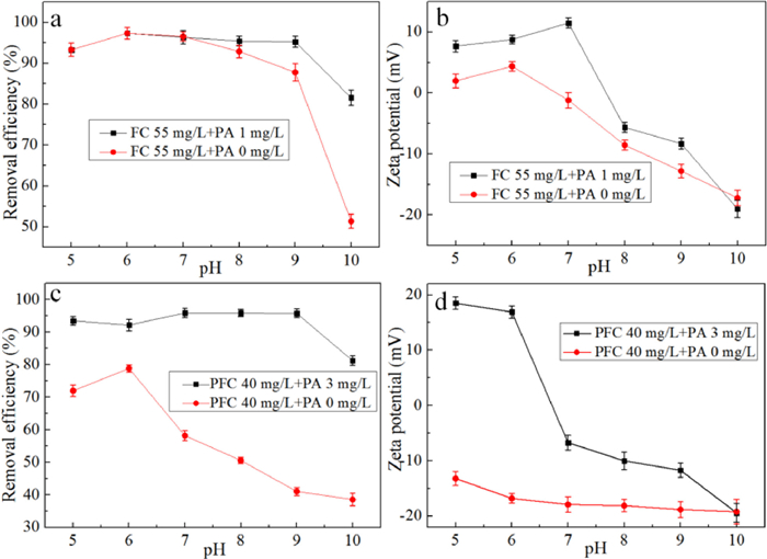 | Fig. 2. Effect of pH condition on removal efficiency (a) FC-PA, (c) PFC-PA and zeta potential (b) FC-PA, (d) PFC-PA. | |