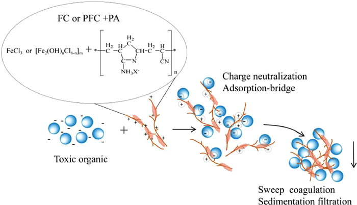 The above results show that the pH can affect the hydrolysis behavior of FC and PFC in water. The polynuclear hydroxy complexes of iron or polyferricpolymers are a system of intermediate compounds produced in the Fe(Ⅲ) solution by the continual processes of hydrolysis, complexation, polymerization, solation, precipitation and gelation. In the hydrolysis of Fe(Ⅲ), Fe can be divided into three morphologies: Fe(a), Fe(b), Fe(c) [20,21]. Among them, Fe(a) and Fe(b) are active components, especially Fe(b) is the most effective component which has stronger coagulation performance. Fe(c) is chemically inert and has poor coagulation effect. Lower pH results in lower OH− concentration in water, Fe(a) cannot be converted into highly positive hydrolysate Fe(b) and then contact with the organics, thus leading to poor coagulation effect. Then, the increase of pH led to the increase of OH− concentration in water, followed by a gradual increase in the yield of Fe(b), so the coagulation effect becomes better. In this process, both charge neutralization and adsorption-bridge play important roles in the removal of organics. Finally, Fe(Ⅲ) hydrolyzes rapidly as the pH of the water becomes alkaline [22]. As is known to all, PFC is a forced hydrolysis product of FC. The increasing concentration of OH− cause more precipitation of Fe(OH)3 and great reduce of positive charge density. At this time, the zeta potential becomes negative, both FC and PFC lose the ability of charge neutralization, which led to a sharp decrease in coagulation effect. In the presence of PA, however, its long-chain structure increases its adsorption-bridge capacity. Even when the pH is high for invalidation of Fe(Ⅲ), the positively charged PA acts through both charge neutralization and adsorption-bridge, keeping the removal efficiency at a high level. It can be seen that the addition of PA can make the coagulants adapt to a wider pH range, and can remove the organics more effectively. To better understand the mechanism of organics removal by coagulation taking place between coagulants and RTB, a preliminary depiction of the process is proposed in Fig. 3. It is well known that the coagulants can induce coagulation through charge neutralization [23]. RBT with negatively charged reacts easily with PA, which is cationic. Iron salt coagulants exhibited strong bridge adsorptive performance. The structure consists of polynuclear hydroxy complexes with variable morphology; thus, it reacts easily with the reactive groups (–Cl and –SO3Na) in RBT [24]. Finally, because of the polymeric properties of the hydrolysis of iron salts coagulants and the macromolecular structure of PA, sweep coagulation and sedimentation filtration mechanism could be the dominant mechanism.