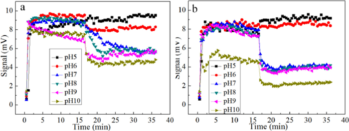 Effect of pH condition on removal efficiency of RTB and zeta potential by FC and PFC in the presence or absence of PA was investigated by adjusting the primitive pH of RTB solution, which was settled in the range of pH 5.0~10.0 (Fig. 2). When FC was used alone, the removal efficiency was improved with pH increasing in the range of 5~6. Then the removal efficiency decreased slowly and maintained at around 90% in the pH range of 6~8. Finally, the removal efficiency reduced greatly (50%) when pH exceeded 9.0. The removal efficiency of RTB was quite different when PA was added in the system. The RTB removal efficiency changed gently at pH 5~9, showing a gradual and slow decrease. It decreased significantly above pH 9 but remained above 80%. As shown in Fig. 2b, in the FC alone system, the zeta potential of floc increased sharply at pH 5.0~6.0 and then decreased gradually with the increasing of pH from 6.0 to 10.0. In acidic condition, the hydrolyzation of Fe was limited to the positive electricity due to the lack of OH−. As a result, decoloration mechanism was based on the charge neutralization in this condition. However, the zeta potential trended to decline with the further increase of pH, which suggested that charge neutralization was weakened at pH from 6.0 to 9.0.