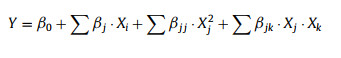 where Y = response, β0 = intercept, βj = linear coefficients, βjj = squared coefficients, βjk = interaction coefficients, Xi, Xj2, Xj, Xk = level of independent variables, and