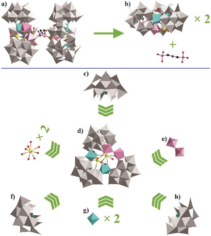 | Fig. 1. Ball-and-stick and polyhedral representations of catalyst 1. (a) Ball-and-stick and polyhedral representations of polyanion 1a. (b, d) Ball-and-stick and polyhedral representations of {Sm2(H2O)4W4O10(AsW9O33)3}. (c, f, h) Ball-and-stick and polyhedral representations of {AsW9O33}. (g, e) Polyhedral representations of [WO6] and [W2O11], respectively. Color code: WO6, gray-25% or aqua; W2O11, rose; As, teal; C, black; N, blue; P, pink; O, red; Sm, yellow. | |