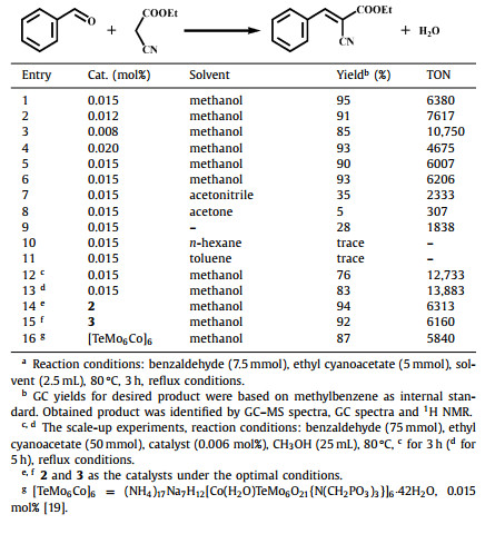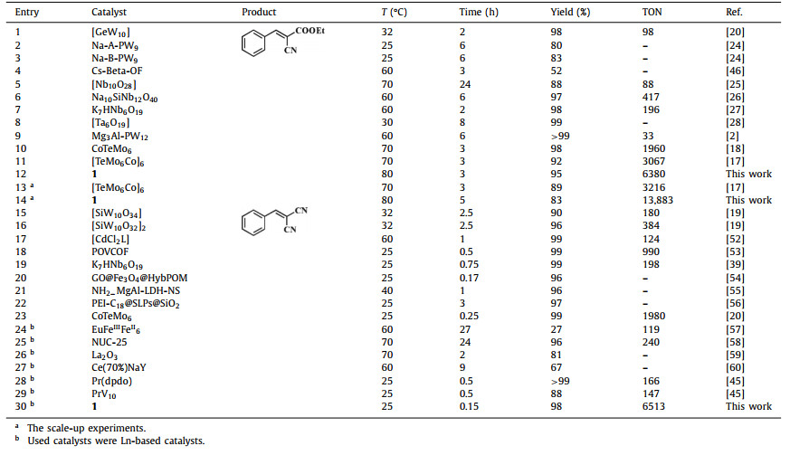 The effects of catalyst loading, reaction temperature, and solvents were investigated using 1 to identify the premium reaction conditions. As shown in Table 1, when adding catalysts from 0.008 to 0.015 mol%, the yield and TON value of desire product show an upward trend (Table 1, entries 1-3). However, both yield and TON value start to drop slightly when further adding catalysts (entry 4, 0.020 mol%), probably caused by the agglomerate of catalysts [47,48]. By comprehensive consideration of yield, TON value, and catalyst consumption, the optimal catalyst loading was locked at 0.015 mol%. Besides, reaction temperature at 80 ℃ is able to give the best catalytic performance (yield = 95%, TON value = 6380). As a result, 80 ℃ was decided as the suitable reaction temperature for further investigations. Moreover, the role of solvent is non-negligible and significant. Under the conditions of aforementioned influence factors, we also conducted the screening of solvent and summarized their results in Table 1, entries 1 and 7-10. It shows methanol could afford the desired product in excellent yields and splendid TON value, much better than reaction results carried out in acetonitrile and acetone representing non-protonic solvents. Non-polar solvents, such as n-hexane and toluene were also studied where the catalytic progresses hardly proceed well. In short, polar protonic solvent is beneficial in this catalytic progress, which is in good accord with reported literatures [19,20,43,49–51]. Furthermore, the catalytic activity of catalyst 1 was further verified by scale-up experiments to study its application potentials (Table 1, entries 12 and 13). Taking account of above results, the optimal conditions (Table 1, entry 1) had been determined for the subsequent catalytic evaluation. To benchmark the performance of catalyst 1, we synthesized a reported POMs-based catalyst [19] (abbreviate as [TeMo6Co]6) and employed it to catalyze this process under the optimal reaction conditions as a reference (Table 1, entry 1 vs. 15). It clearly shows that catalyst 1 outperforms [TeMo6Co]6 in both product yield and TON values. Notably, to our best knowledge, catalyst 1 exhibits comparable or even better catalytic performance than reported catalysts in promoting Knoevenagel condensation reaction (Table 2), while maintaining a much higher TON value.