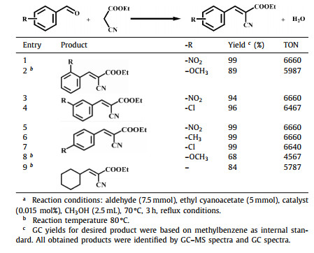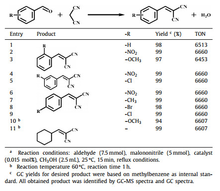 Table 3 Reaction of various aldehydes with ethyl cyanoacetate over catalyst 1.a |