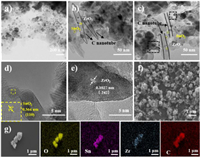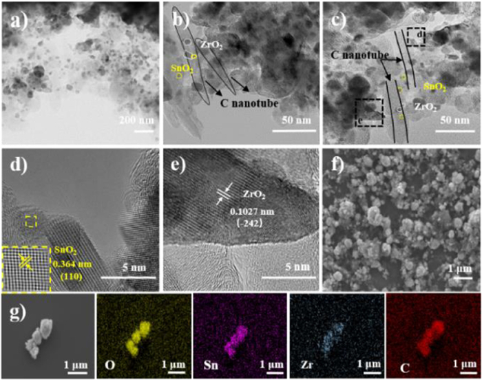 | Fig. 1. (a–c) TEM images of SnO2/C/ZrO2. (d, e) High-resolution TEM images of SnO2/C/ZrO2. (f) SEM images, (g) SEM images and element mapping images of SnO2/C/ZrO2. | |