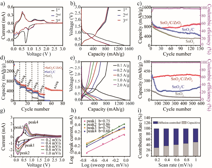 | Fig. 2. Electrochemical performance of SnO2/C/ZrO2 electrode for lithium storage. (a) CV curves at a scan rate of 0.1 mV/s. (b) Dis-/charge in the voltage range of 0.01-3.0 V at a current density of 0.1 A/g. (c) Cycling performance of SnO2/C/ZrO2, SnO2/C and SnO2 electrodes at the current density of 0.1 A/g. (d) Rate capacity at various current densities. (e) Initial dis-/charge cycle at 0.1, 0.2, 0.5, 1 and 2 A/g, respectively. (f) Long-term cycling performance at a current density of 1 A/g and the corresponding Coulombic efficiency of SnO2/C/ZrO2 electrode. (g) CV curves at different scan rates. (h) The corresponding plots log(i) versus log(ν) at each redox peak. (i) Contribution ratio of capacitive at various scan rates. | |