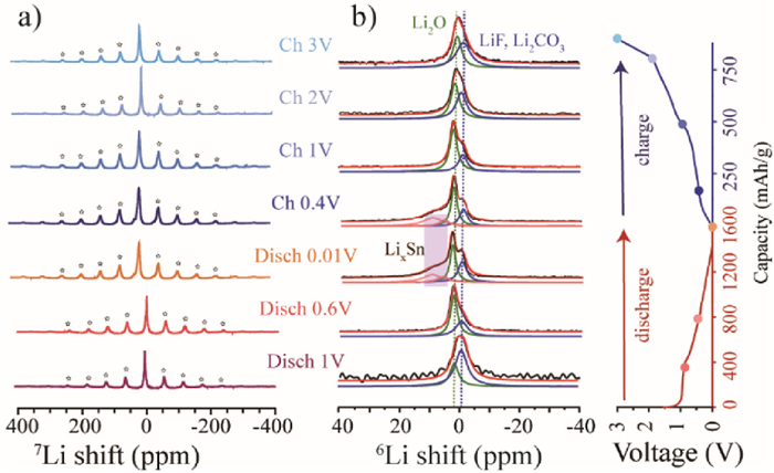 | Fig. 3. Solid-state (a) 7Li NMR and (b) 6Li NMR spectra for SnO2/C/ZrO2 electrodes at various electrochemical cycling states. Spinning sidebands (SSBs) are noted as asterisks. The cycling curve is plotted to the right. | |