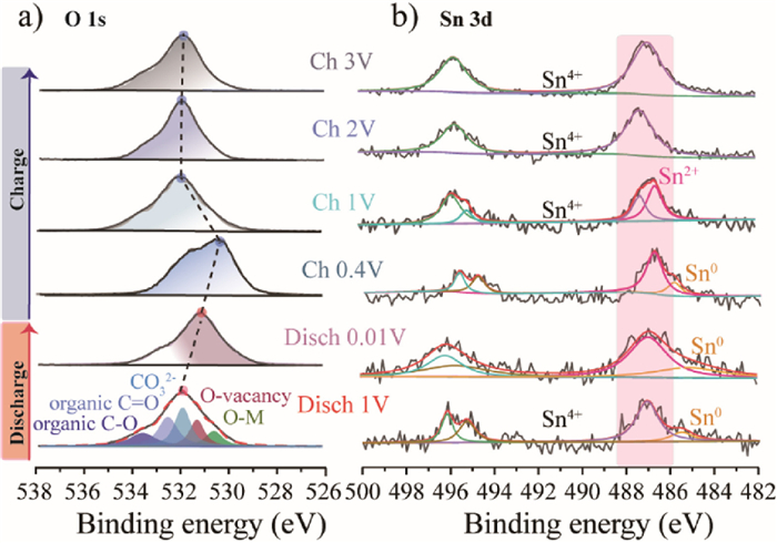 Furthermore, the O 1s from ex-situ XPS (Fig. 4a) indicates that C-O, C=O, CO32− and O-M appeared in the electrode upon discharge to 1 V [39]. The peak at ~531.6 eV is possibly from oxygen vacancy. The peak of O 1s with binding energy decreases slightly during the discharge process [45]. This phenomenon is possibly attributed to the outer electrons having a shielding effect on the inner electrons, when the density of the outer electrons increases, the shielding effect is enhanced, resulting in a decrease in the binding energy. Reverse evolution of peak is observed in the subsequent charge process. The presence of oxygen vacancies could promote ion diffusion kinetics, improve electronic conductivity, and provide additional active sites involved in Li+ storage [46]. XPS of Sn 3d is plotted in Fig. 4b for the cycled anodes. The detailed information of Sn in pristine SnO2/C/ZrO2 could refer to Fig. S1. When the anode is discharged to 1 V, the binding energy of Sn slightly moves to a lower value, which means a small number of Sn ion is reduced due to the injection of electrons from the outer circuit. The binding energy of Sn shows a much more obvious shift upon further discharge from 1 V to 0.01 V. Nevertheless, metal Sn0 (~485.8 eV) is observed upon charge to 0.4 V [47], revealing the formation of alloying. When the anode is further charged to 3.0 V, intense oxidation occurs to form more Sn4+ [48].