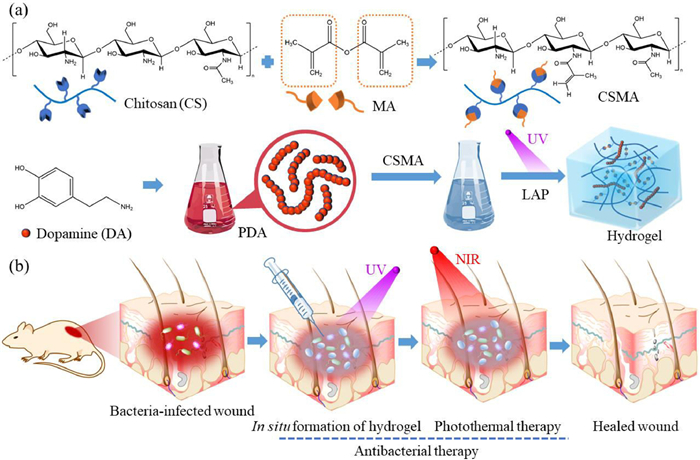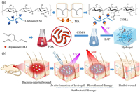 | Fig. 1. Schematic illustration of preparation of CSMA/PDA hydrogel and its application assisted with photothermal antibacterial property to prompt mice infected skin wound healing: (a) Diagram of the method used to prepare CSMA/PDA injectable hydrogels. (b) The constructed hydrogel dressing can promote wound healing by synergistic photothermal antibacterial. | |