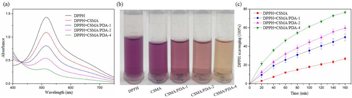 | Fig. 2. (a) UV–vis spectra of the DPPH reaction with hydrogel scaffolds after 160 min (From top to bottom, DPPH, CSMA, CSMA/PDA-1, CSMA/PDA-2 and CSMA/PDA-4). (b) The image of the DPPH solution reaction with hydrogel scaffolds after 160 min. (c) DPPH scavenging efficiency of the hydrogel scaffolds at different time points (n = 4). All experimental results were expressed as a mean ± standard deviation (SD). | |