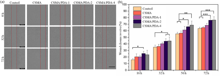 Since cell migration is essential for healing/regeneration of wound tissue, scratch assay in vitro as a simplified model of wound to evaluate the effect of extraction media from the hydrogel on proliferation and migration of L929 fibroblasts [75]. Fig. 4a show the photos of each selected field of view at representative time points, revealing that the extracts from hydrogels can fasten the scratch reparation process. The quantitative analysis of wound closure (Fig. 4b) showed that wound closure rate for the CSMA/PDA-2 hydrogel group was 25.39%, which is significantly higher than that of the control group (15.78%, P < 0.05) at 16 h. After 72 h of treatment, the wound closure rate of the CSMA/PDA-4 hydrogel treated group was the highest, reaching 76.38%, which was significantly higher than that of the control group by 12.98% (P < 0.001). Moreover, the CSMA/PDA-2 hydrogel and CSMA/PDA-4 hydrogel treated groups also had a significant increase (P < 0.001) compared with the pure CSMA hydrogel treated group (64.78%) after 72 h of culture. As a result, the scratch test analysis confirmed that extracts from the CSMA/PDA hydrogels can promote the migration and proliferation of fibroblasts, especially PDA that has been demonstrated to facilitate the improvement of cell viability in MTT.