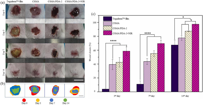 | Fig. 5. (a) Representative photographs of wounds from days 0 to 14 of TegadermTM dressing, CSMA, CSMA/PDA-2 hydrogel, and CSMA/PDA-2 + NIR treatment. Scale bar: 10 mm. (b) Wound traces for different treatment days. (c) Evolution of wound area ratio for different treatment days (n = 4). All experimental results were expressed as a mean ± SD. P < 0.05, ****P < 0.0001. | |