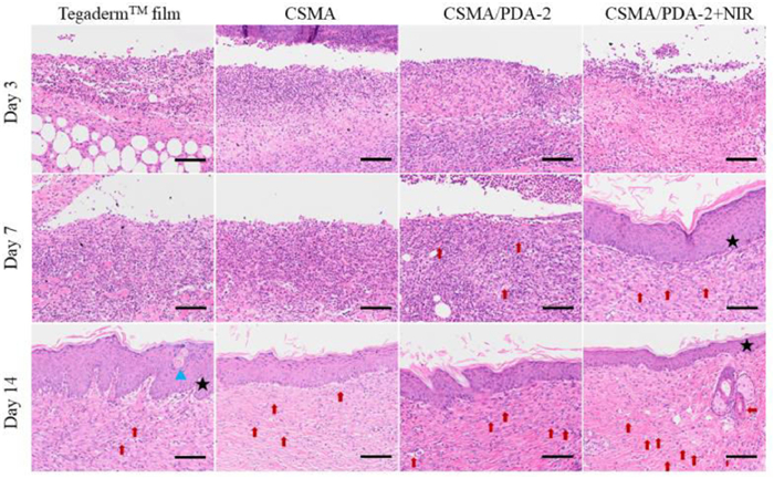Wound regeneration effect was evaluated by means of observing infiltration of inflammatory cells, fibroblast immigration, connective tissue synthesis and re-epithelization. On day 3, abundant macrophage infiltration appeared in all groups, including groups Tegaderm dressing and hydrogels. Attractively, compared with commercial dressing group and CSMA hydrogel group, inflammatory cell infiltration was fractionally inhibited and much more fibroblasts were clustered around the wound region treated with hydrogel CSMA/PDA-2 under NIR laser irradiation. On the 7th day, the group of hydrogel CSMA/PDA-2 with NIR laser irradiation exhibited complete re-epithelialization, with the thicker granulation tissue and more obvious fibroblast proliferation observed (Fig. 6). In comparison with the groups of film dressing and hydrogel CSMA, the CSMA/PDA-2 hydrogel treatment group demonstrated comparatively more granulation tissue with a number of fibroblast cells and microvessels around the impaired region, expediting continuous proliferation of the surrounding basal cells and migration to the wound surface to form new epithelial cells [77]. Relevant studies have shown that PDA with antioxidant effects is capable of promoting wound healing through controlling the level of reactive oxygen species at the wound sites during the wound repair process [55,77]. On the 14th day, epithelialization was complete in all the groups, while the film dressing group showed the thickest epidermis with necrotic tissue occurring inside the epidermis. On the contrary, the hydrogel treatment groups demonstrated a great number of tightly-connected connective tissues under the skin, including fibroblasts. Furthermore, the treatment group of the hydrogel assisted with NIR laser exhibited the thinnest skin with numerous angiogenesis and dermal appendices, concluding hair follicles and sweat glands. These properties, coupled with good cytocompatibility and adhesion property, suggest that the CSMA/PDA hydrogel dressing is a promising candidate for accelerating tissue repair during bacteria infected wound healing.