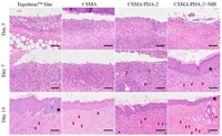 | Fig. 6. H&E staining of skin tissues of mice wounds at different times (★: epidermis, ↑: blood vessel, ▲: necrotic tissue). Scale bar: 100 µm. | |