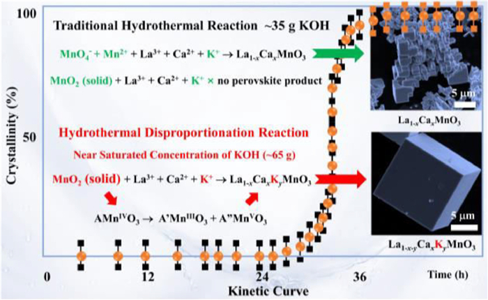Motivated by the above discussions, here we present a new bottom-up method to synthesize a monodispersed perovskite La0.66Ca0.29K0.05MnO3 (LCKMO) with (LaMnO3)1-(La1-x-yCaxKyMnO3)2 superlattices by engineering a disproportionation reaction. As opposed to the disproportionation process of Mn3+ from perovskite oxide to ordered MnO2 solids in strong acid, the disproportionation process of Mn4+O2 under strongly alkaline conditions is employed in the manufacturing of perovskite superlattices. Our experiments show that an approximate molten salt system under extreme hydrothermal conditions induces the disproportionation reaction of Mn4+O2 solids and facilitates the doping of three types of A-site cations (e.g., La3+, Ca2+ and K+) in perovskite superlattice. It is well-known that Mn element exists various valence states from Mn0 to Mn7+ and high-valence Mn ion is easy to be stabilized in strong alkaline condition. A strong alkaline condition is also beneficial to the dehydroxylation reaction of hydroxide in the hydrothermal process. Furthermore, K+ ion can be easily doped into the lattice of perovskite La0.7Ca0.3MnO3 [26]. Therefore, the disproportionation reaction of MnO2 solids are used to prepare perovskite superstructure. As shown in Fig. 1, MnO2 solid, La(NO3)3, Ca(NO3)2 and 65 g KOH as reagents are used to synthesize perovskite oxide with superlattices. After undergoing the hydrothermal dissolution stage for 24 h, these ions are transported into the growth region to begin hydrothermal crystallization for 48–72 h (Fig. 1). During the first 24-h hydrothermal process, no product is obtained. After 24 h, the target material starts to increase and crystallize. After 40-h hydrothermal reaction, the quality of the product keeps unchanged. After a 72-h hydrothermal reaction, this perovskite LCKMO with superlattices is successfully prepared. To study the effect of KOH on superlattices, perovskite La0.8Ca0.2MnO3 (LCMO) as a reference sample is synthesized via a similar method using 25–35 g KOH at 260 ℃ for 48–72 h. Different from the single cube morphology of prepared LCKMO, the polycrystalline perovskite LCMO is assembled by many staircases' defective cubes (Fig. 1). When the mass of KOH is greater than 65 g, whether the Mn sources are KMnO4 and MnCl2 or a MnO2, the K+ ion can be doped into the lattice. However, when the mass of KOH is less than 40 g, K+ ion cannot be doped into perovskite lattice and MnO2 solid is not used as raw materials to prepare perovskite oxides under other same reaction conditions (Figs. S1 and S2 in Supporting information). Therefore, the mass of KOH and Mn source are of vital importance to the synthesis of perovskite materials, the doping of K+ ions, and the regulation of superlattices.