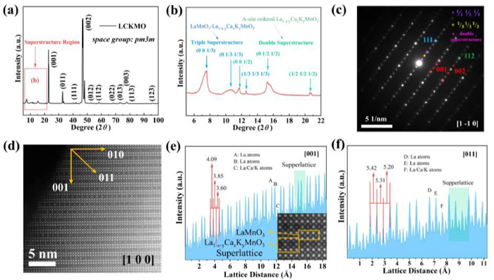 | Fig. 2. Crystal structure and atomic scale superlattices of perovskite LCKMO. (a) X-ray diffraction (XRD) patterns of perovskite La0.66Ca0.29K0.05MnO3. (b) Enlarge image for XRD at the 2θ degree of 5°−22°. (c) SAED patterns along [110] zone axis and (d) atomic-resolution HAADF-STEM images along [100] zone axis for perovskite LCKMO with (LaMnO3)1-(La1-x-yCaxKyMnO3)2 superlattice. Intensity profile across the LCKMO measured from (e) crystal facet (001) and (f) crystal facet (011) in (d). The distance between two intensities matches with the separation between crystal facets. A and D represent La atom in LaMnO3, B and E represent La atom in La1-x-yCaxKyMnO3, C and F represent La/Ca/K atom La1-x-yCaxKyMnO3. | |