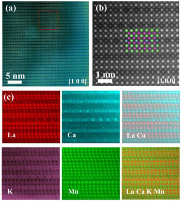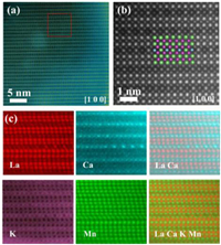| Fig. 3. Atomic-scale elemental mapping and atomic arrangement of perovskite LCKMO. (a) Atomic-resolution HAADF-STEM image of (LaMnO3)1-(La1-x-yCaxKyMnO3)2 superlattices along [100] zone axis. (b) Enlarged atomic arrangement image in red area of (a), where green sphere represents La atom, blue sphere represents Ca/K atom, and pink sphere represents Mn atom. (c) Atomic resolution STEM-EDS chemical mapping of perovskite LCKMO for La, Ca, K and Mn elements. | |