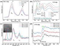 | Fig. 4. (a) O K-edge and (b) Mn L-edge X-ray absorption spectrum of LaMnO3, La0.8Ca0.2MnO3 and La0.66Ca0.29K0.05MnO3. (c) Atomic-scale Mn L-edge electron energy loss spectroscopy (EELS) simultaneously recorded via atomic-resolved EELS mapping found by HAADF-STEM mode along [100] (Fig. 3). (d) The corresponding O K-edge EELS spectra in the three-position of perovskite LCKMO. These shown spectra were obtained using a window corresponding to the sum of four pixels. | |