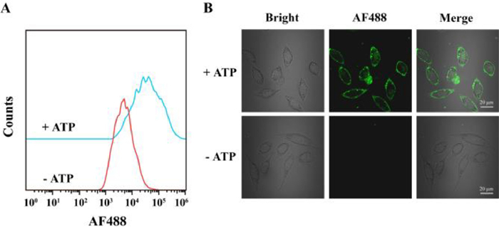 | Fig. 3. Flow cytometry assays (A) and confocal fluorescence imaging (B) of SMMC-7721 cells incubated with Apt-trigger/H1-ATP aptamer/H2 with or without the addition of ATP. | |
